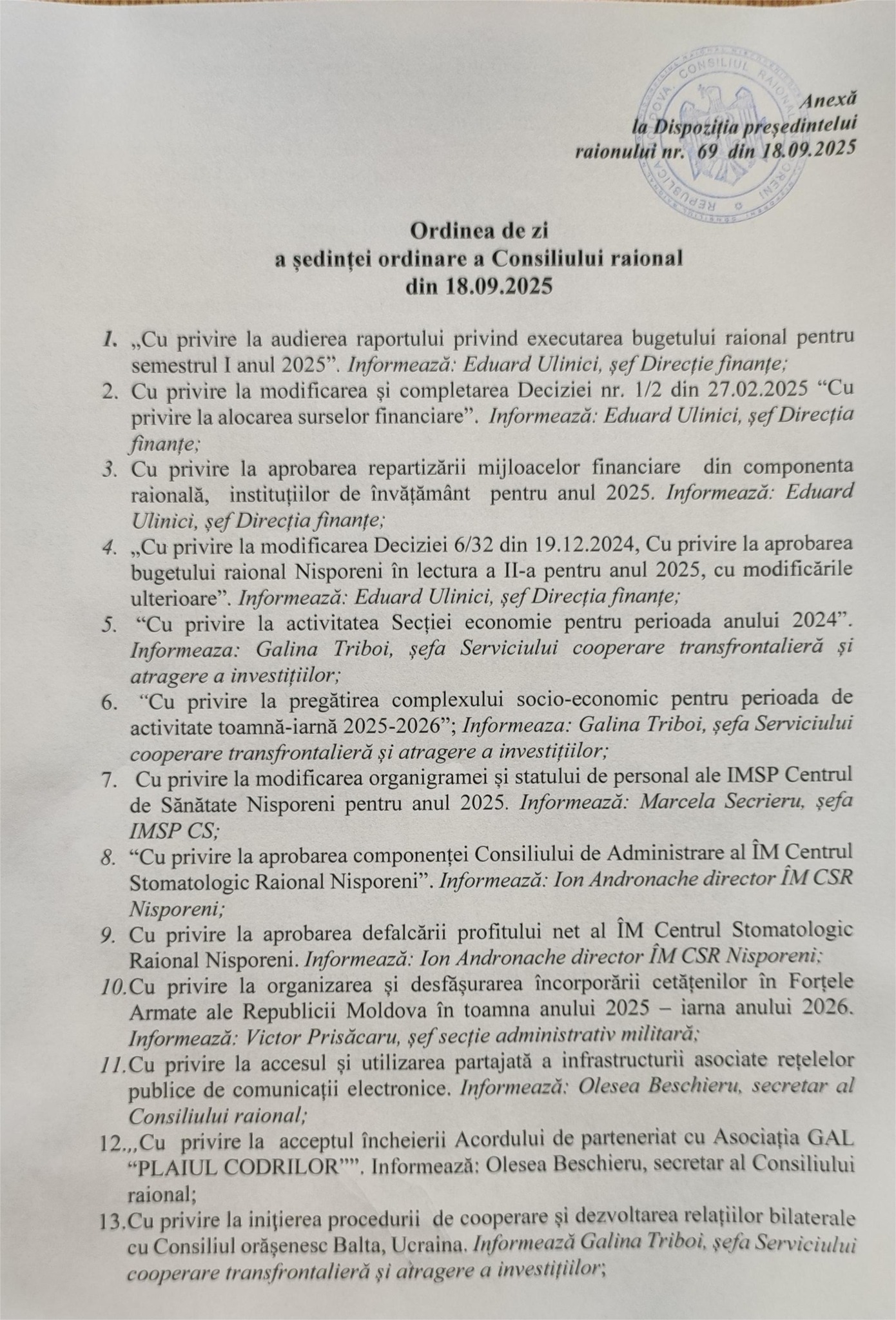 ANUNȚ! Se convoacă şedinţa ordinară a Consiliului raional Nisporeni, la data de 18 septembrie 2025, ora 10. 00, în incinta Consiliului raional Nisporeni, sala mare de ședințe.