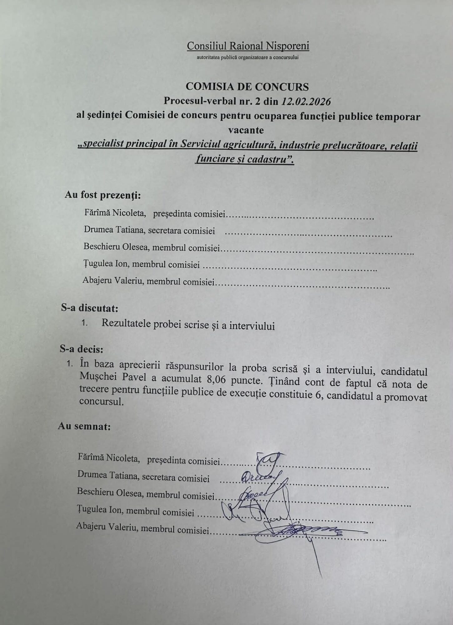 Proces verbal nr.2 din 12.02.2026, al şedinţei Comisiei de concurs pentru ocuparea funcţiei publice temporar vacante ” specialist principal în SAIPRFC