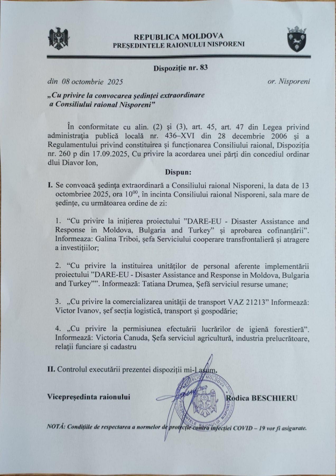 Achiziții publice Proiecte investiționale Funcții vacante Regulamente Declarația de răspundere managerială Comisia pentru Situații Excepționale a raionului Nisporeni Comisia raională extraordinară de sănătate publică